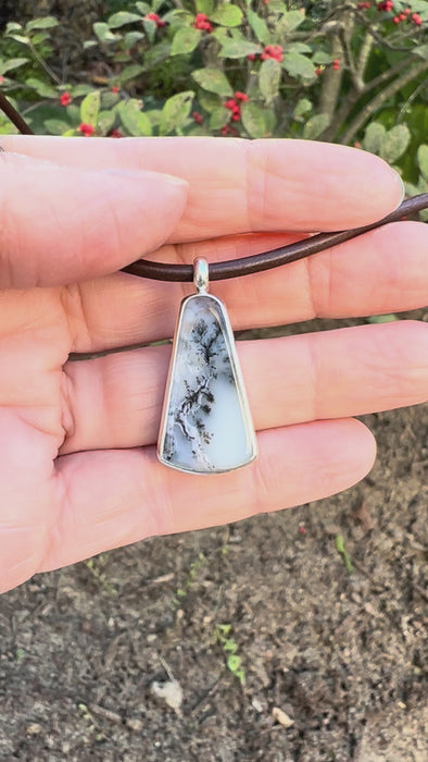 Beautiful black dendrites swirl through the white agate stone in this one-of-a-kind necklace. The piece is set in a fine silver bezel and sterling bail. It hangs on an 18" brown leather cord with a removable sterling clasp. The pendant is 1.5" long and 5/8" at the widest point.